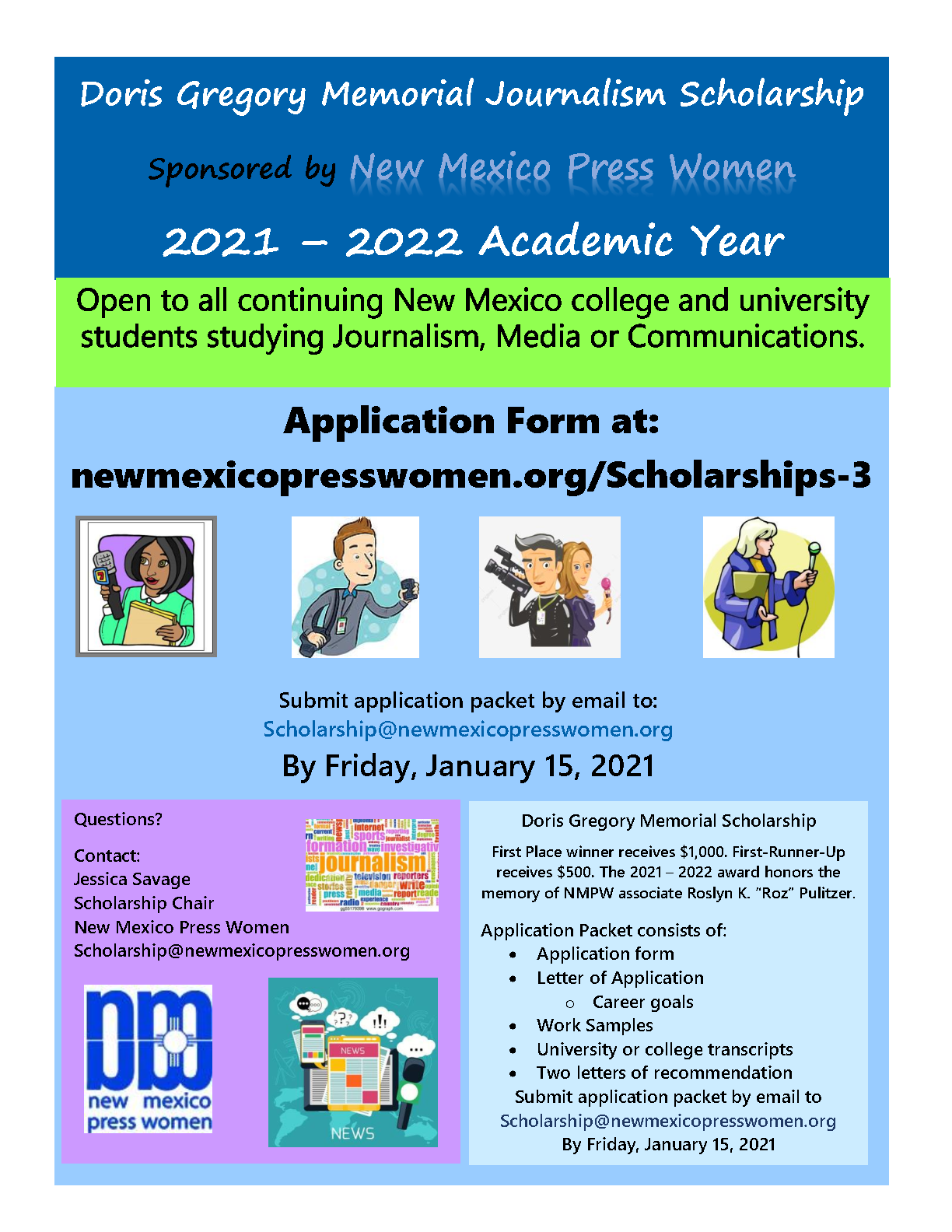 New Mexico Press Women invites university and college students to apply for a higher education scholarship offered for the 2021–2022 academic year. NMPW annually awards two Doris Gregory Memorial Journalism Scholarships. The first-place winner will receive $1,000, while the first-runner-up will receive $500. The 2021–2022 award will also honor the memory of press women friend Roslyn K. “Roz” Pulitzer, who passed away earlier this year.